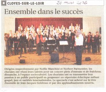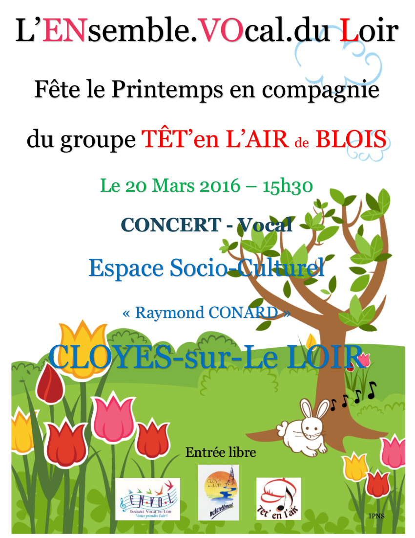 Mars 2016 Fête du Printemps à Cloyes sur Le loir (28) à l'invitation de la Chorale L'Envol, L'Ensemble Vocal du Loir, une belle rencontre avec un public chaleureux