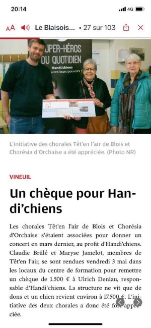 La Chorale Choresia de Onzain et le Groupe vocal Têt'en l'air de Blois sont heureux de remettre un chèque de 1500€, celui ci permettra à l'association de continuer leur mission auprès des personnes en situation de handicap, enfants et adultes, sachant qu'il faut 22 mois pour l'éducation avant de remettre un chien d'assistance gracieusement.