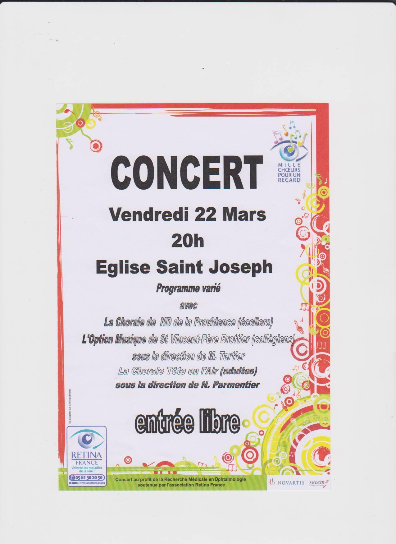 Pour la 19ème édition de « Mille chœurs pour un regard », l’église Saint Joseph de Blois accueillait la chorale de l'école primaire Notre Dame de la Providence, l'ensemble de l'Option musique du Collège St Vincent-Père Brottier, et le Groupe vocal Blois sud Têt'en l'air.