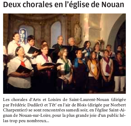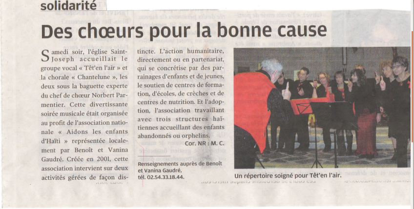 En Mars, un dimanche après-midi, l'église Notre-Dame s'est vite remplie de nombreux spectateurs venus écouter les prestations de deux groupes blésois de chants, Tet'en l'air et les Essentielles, un concert au profit de l'association Agir pour l'enfant et l'association nationale Aidons les enfants d'Haïti, représentées localement par Vanina et Benoît Gaudré, eux-mêmes parents d'enfants adoptés, Elouan et Mervedie.Tet'en l'air, ce sont 28 chanteurs bénévoles qui mettent à l'honneur la chanson française sous la direction de Norbert Parmentier, professeur de musique retraité, qui a enseigné la flûte et le saxophone dans les écoles de musique d'Herbault, de Cellettes, de Fossé… Les Essentielles sont un groupe gospel de quatre sœurs, Fabienne et Rebecca, étudiantes et les deux jumelles, Sarah et Déborah, animatrices, quatre belles et puissantes voix qui ont été très appréciées par les spectateurs.