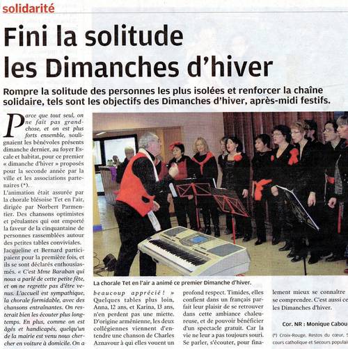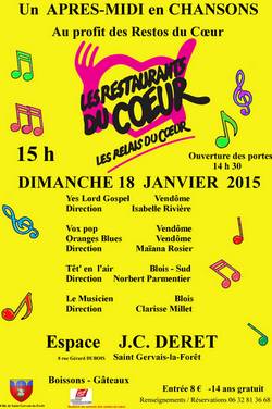 Janvier 2015, nous organisons un après-midi en chansons, au profit des Restos du Cœur de Blois, avec la participation de 3 groupes dynamiques et joyeux aux tonalités différentes.