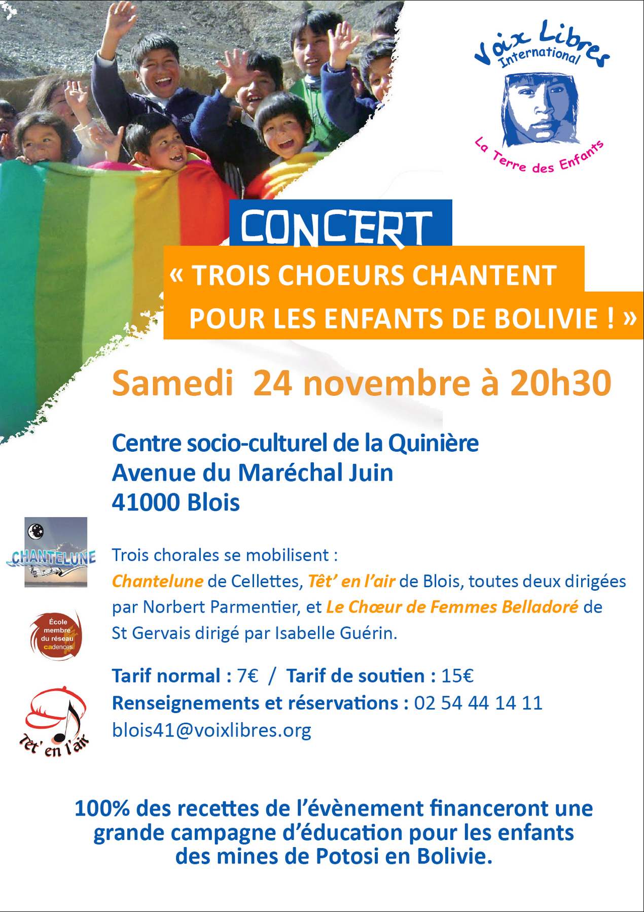 Trois chorales de la région se rejoignent pour un concert au bénéfice de Voix Libres afin de venir en aide aux enfants les plus pauvres de Bolivie .Il s'agit de Chantelune de Celettes,Têt' en l'air de Blois, toutes deux dirigées par Norbert Parmentier et Le Chœur de femmes Belladoré de St Gervais dirigé par Isabelle Guérin.